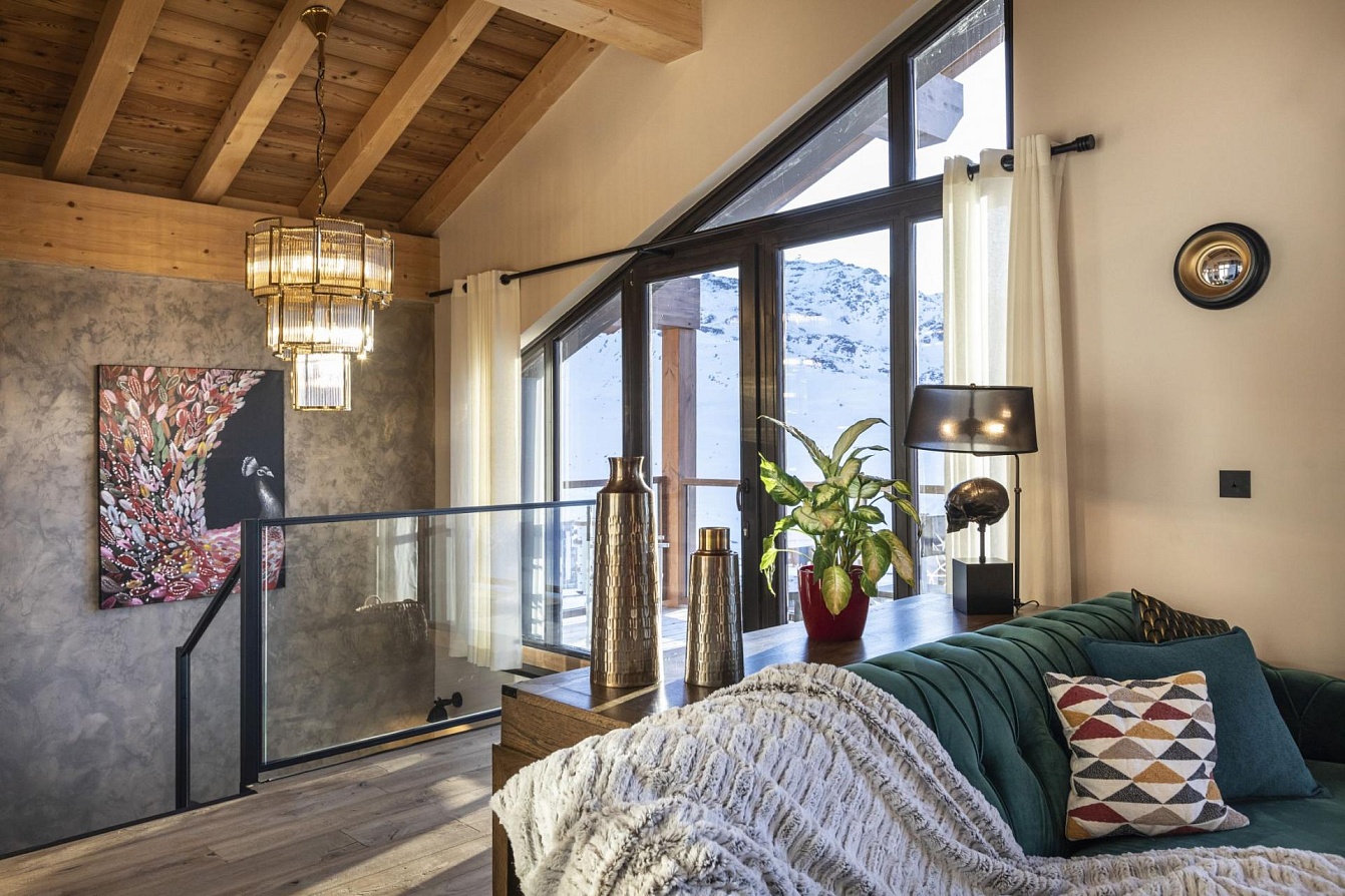 The chalet accommodates ten guests in five thoughtfully designed bedrooms, all with en-suite facilities. Two master suites boast private balconies with mountain views and spacious dressing areas, offering a serene sanctuary. The remaining bedrooms, including a dedicated children's twin room, provide flexible double or twin configurations. The interiors continue the elegant theme of soft, calming colours, rich woods, and luxurious textiles, ensuring restful repose after each alpine day.