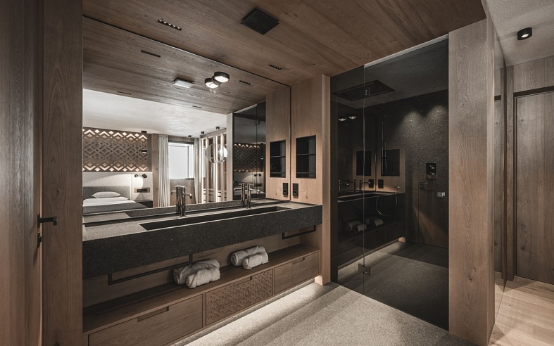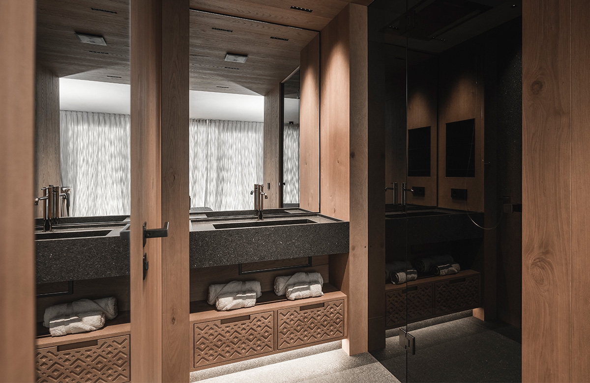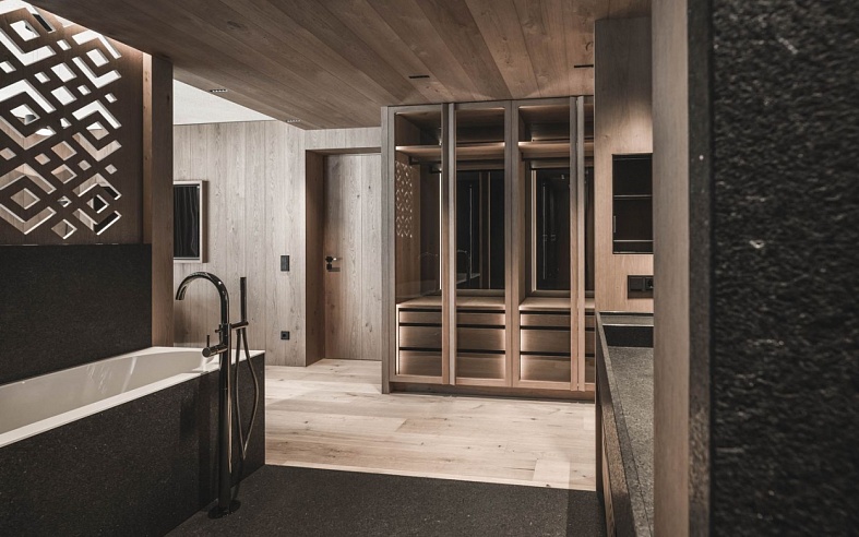 Unwind in the chalet’s exclusive wellness area, featuring a sauna, Turkish bath, Jacuzzi, and sensory showers. For active guests, a Technogym-equipped fitness room promises invigorating workouts. Step outside to a 700 sqm garden oasis, where a multifunctional outdoor whirlpool soothes tired muscles after a day on the slopes. Sun loungers and a tranquil terrace invite moments of stillness amid the Dolomites’ raw beauty.