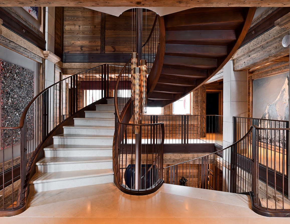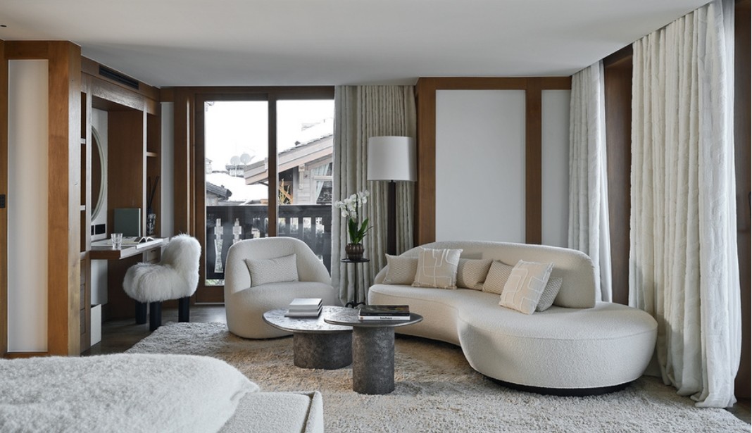 The third floor unveils an awe-inspiring, triple-aspect living and dining pavilion. Panoramic windows and a wrap-around balcony frame uninterrupted mountain vistas, bathing the space in natural light. Twin reception areas, anchored by a welcoming fireplace with sumptuous seating, flow effortlessly into a formal dining room where a bespoke table hosts up to 24. This is altitude of alpine living, designed for grand entertaining and intimate moments alike.