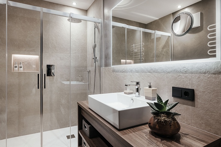 Unwind in the private spa area, where a swimming pool with a whirlpool and counter-current system awaits, alongside a sauna and serene relaxation room. Glass doors open to a sprawling terrace, offering yet another vantage point to marvel at the Dolomites. Plush bathrobes, sauna towels, and slippers elevate your wellness experience.