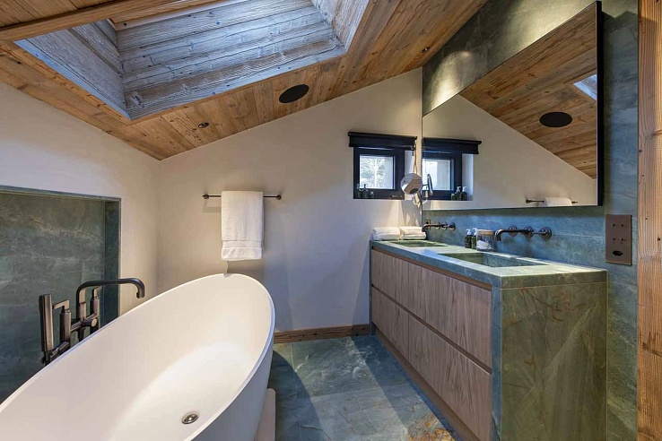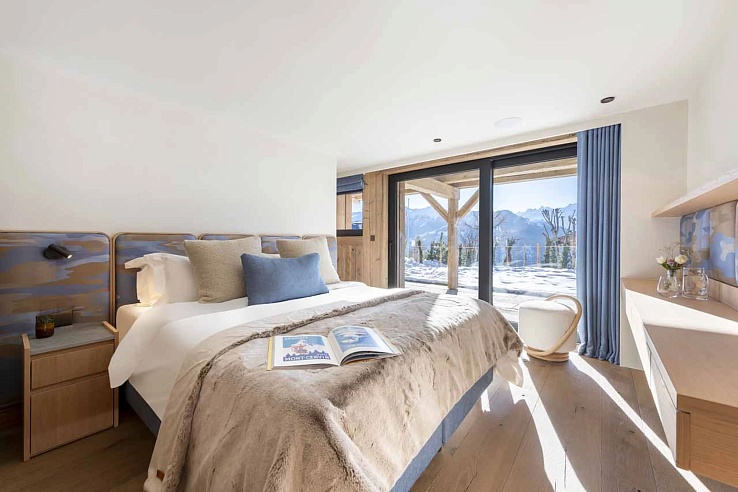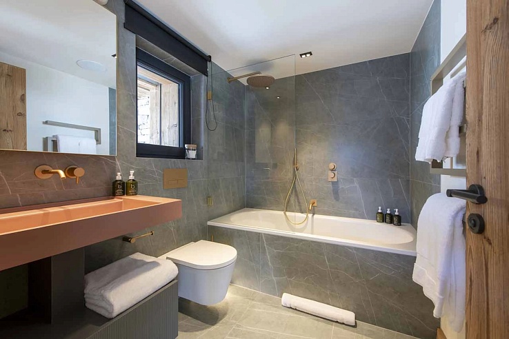 The sleeping quarters are a masterclass in flexible luxury. Occupying the entire top floor, the master suite is a private sanctuary featuring a super-king bed, a dressing room, a private balcony, and a spacious en-suite bathroom. The remaining four bedrooms offer king/twin flexibility, each with its own en-suite bathroom or shower room; most boast direct access to terraces, blending indoor comfort with the alpine atmosphere. This configuration, with all rooms en-suite, makes the chalet ideal for discerning groups of friends or multi-generational families.
