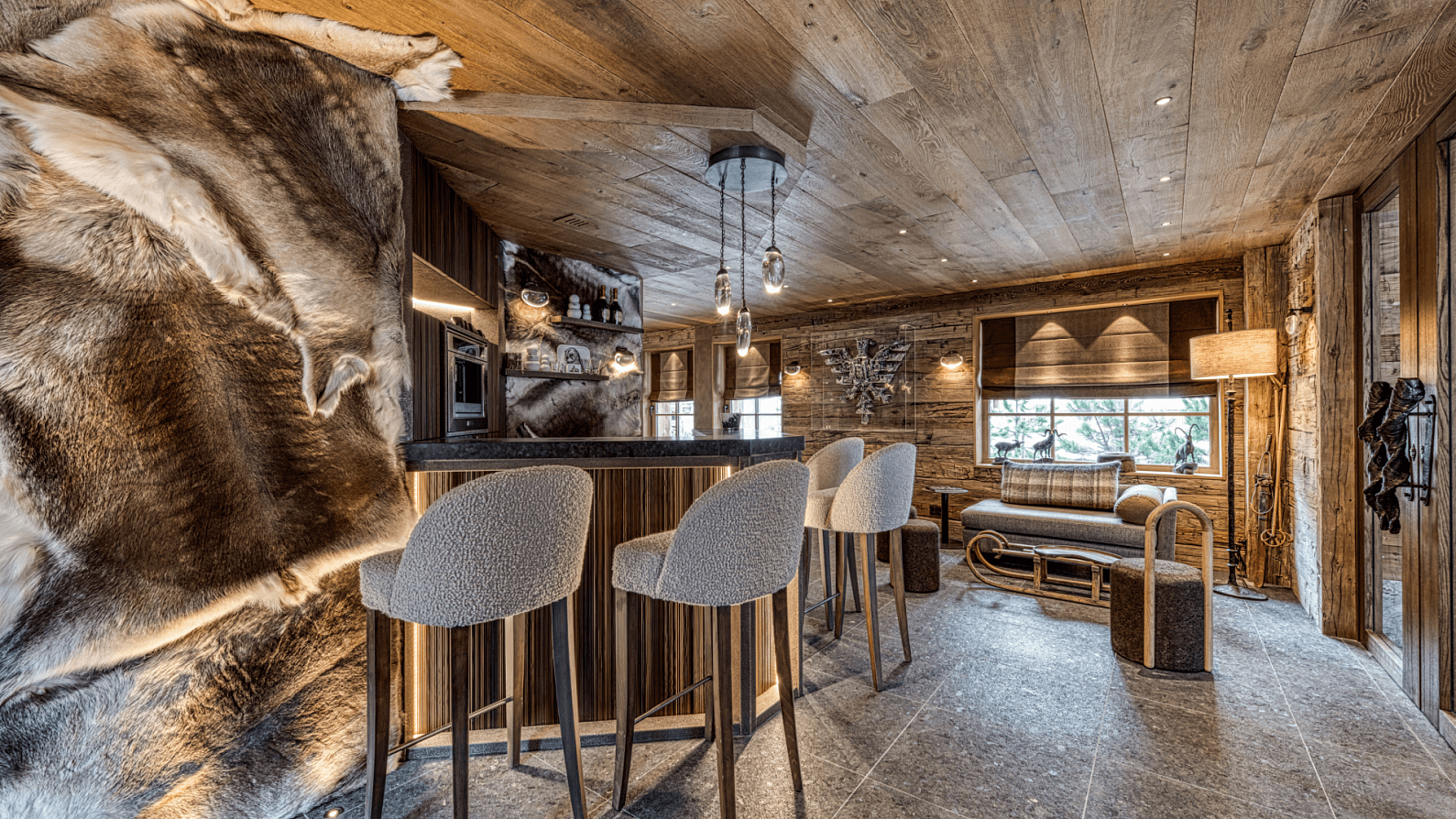 Beyond the main living area, the chalet is designed for diverse and luxurious leisure. The ground-floor bar is the perfect spot for aprés-ski cocktails, while the adjacent games area with table football invites friendly competition. For ultimate relaxation, descend to the lower level to find a state-of-the-art home cinema with layered, plush seating—ideal for movie nights. The comprehensive wellness area provides a space to rejuvenate with its indoor swimming pool, hammam, and sauna.