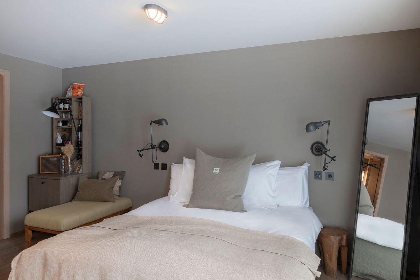 Each of the six spacious bedroom suites is a study in minimalist elegance, with expansive windows ensuring magnificent views from every room. All feature supremely comfortable hand-crafted King-size beds from Hästens, Fender Bluetooth speakers, and 42 inch screens. The master suite is in a league of its own, anchored by a showstopper bathroom where a whirlpool bath sits beside a vast glass wall offering glorious Matterhorn views, complemented by a private sauna and steam room for an unparalleled in-suite spa experience.
