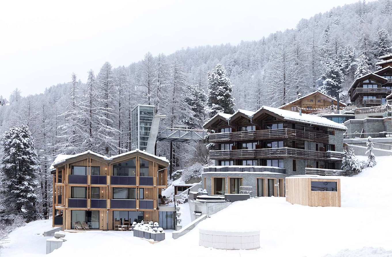 Elevated above Zermatt and surrounded by forest, Huntsman Lodge sits opposite the Sunnegga funicular, offering genuine ski-in access. The vibrant resort center is a scenic 10-minute walk or a quick electro-taxi ride away—the perfect balance of mountain serenity and cosmopolitan convenience.