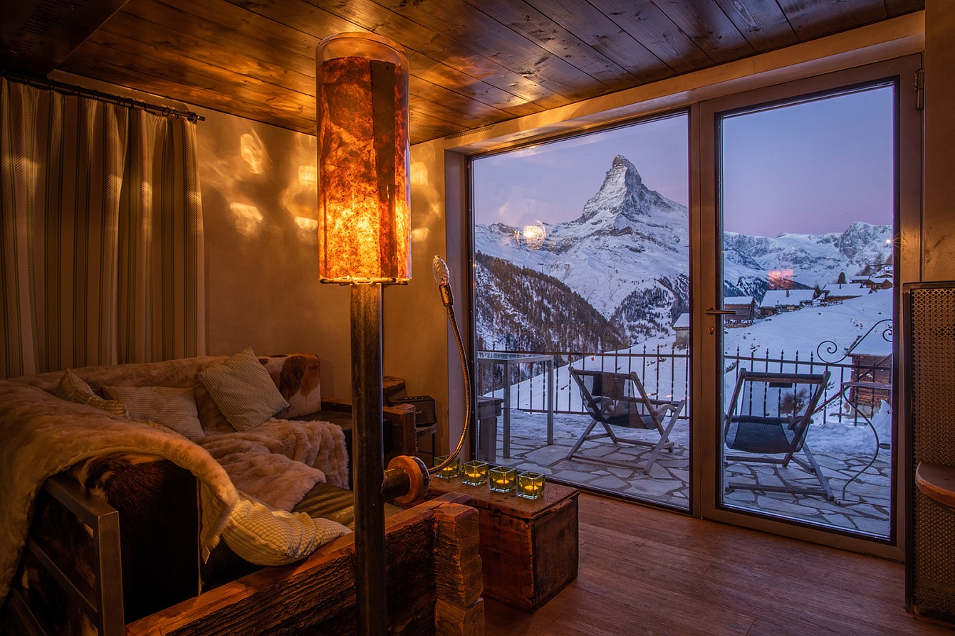 - Mountain Cottage (75 m², 2–4 guests): 300-year-old chalet in Findeln (2,100 m altitude). Sleeping: Double bed plus convertible sleeping nook. Charm: Wood-burning stove, terraces with Zermatt peak views.