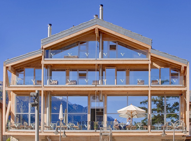- Luxury Chalet (320 m², 7–11 guests): 5 doubles (1 with mezzanine for child). Highlights: 360° mountain views, rooftop Jacuzzi, open-fire lounge. Interior: Expanded 1940s Valais house with larch/glass additions.