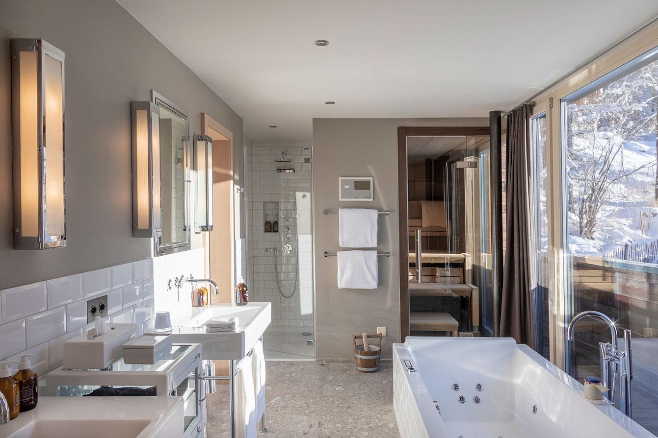 Alpinist Spa Suite (68sqm): One King/Twin bedroom, a separate children's room with two bunk beds, walk-in shower, seating area with fireplace, and a terrace with an outdoor bath, sauna, and sanarium.