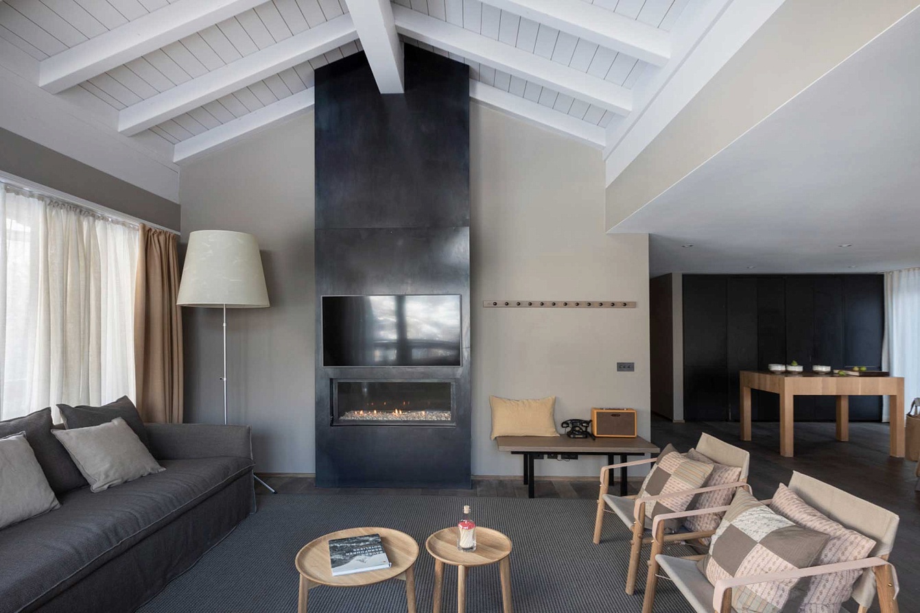 Alpinist Roof Suite (82sqm): King/Twin bedroom with en-suite bathroom, living room with sofa bed, dining area, kitchenette, and fireplace.