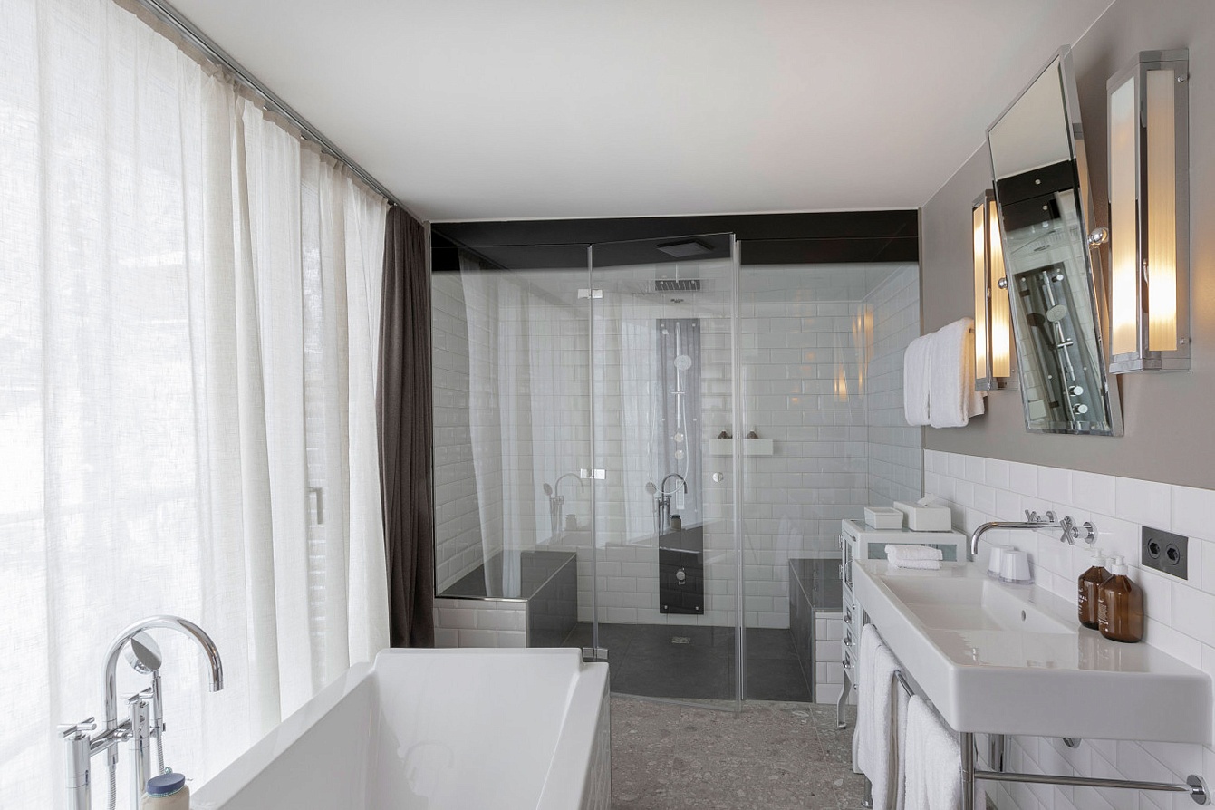 Alpinist L (32sqm): King/Twin bedroom and bathroom with bath and walk-in shower.