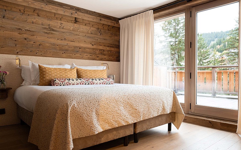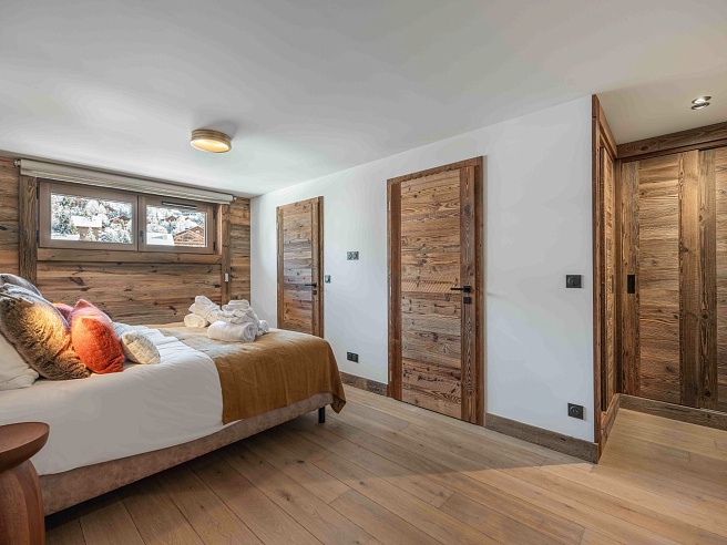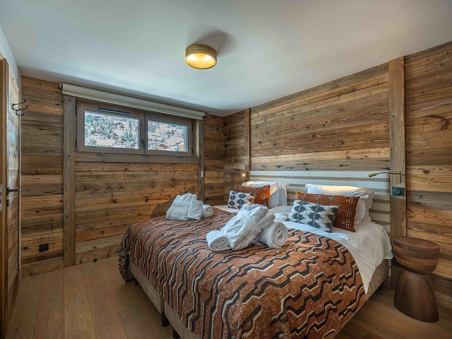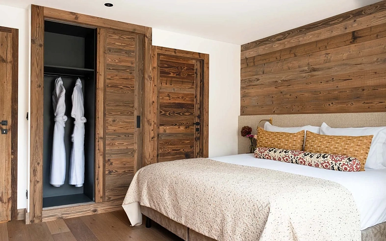 Шале вмещает до 12 гостей в шести тщательно продуманных двухместных спальнях с ванными комнатами. Спальни занимают два верхних этажа, полностью посвященных сну и отдыху. Три спальни имеют выход на собственные балконы, приглашая горные пейзажи стать частью вашего утра. Главные спальни — пространства безмятежности с роскошными ванными комнатами и дизайном, искусно сочетающим отделку из дерева теплых тонов с фактурным текстилем, что создает атмосферу стиля и комфорта.
