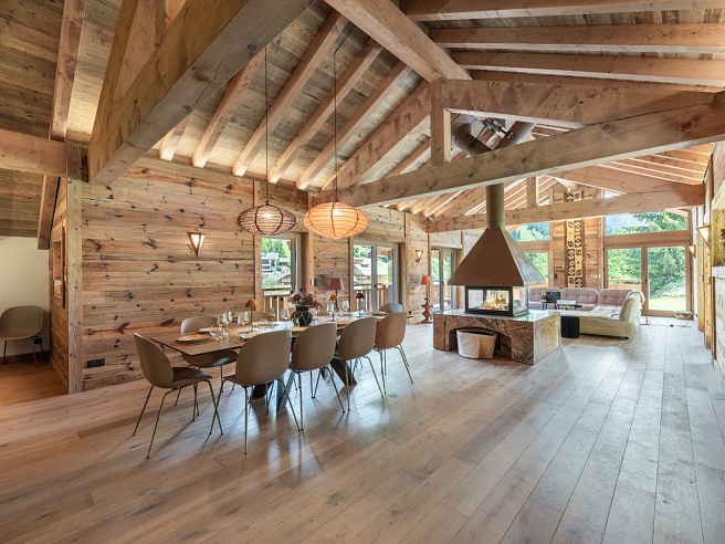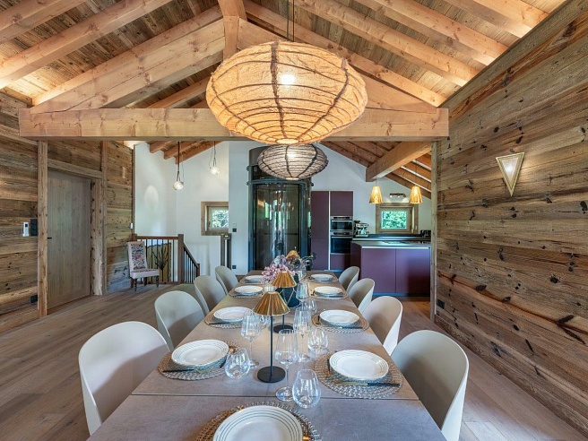 Созданное для теплого общения и уединенного отдыха, шале Elegie состоит из четырех залитых светом этажей. Изюминка шале — просторная гостиная на верхнем этаже, где высокие сводчатые потолки и центральный двусторонний камин задают тон сдержанной роскоши. Панорамные окна в пол открывают захватывающий вид на долину, а прилегающая терраса и балконы становятся вашей личной галереей, приглашающей насладиться горным воздухом. Открытая планировка гостиной, обставленной вместительными диванами и обеденным столом на 12 человек, создает безупречную атмосферу как для шумных застолий, так и для спокойных семейных вечеров.