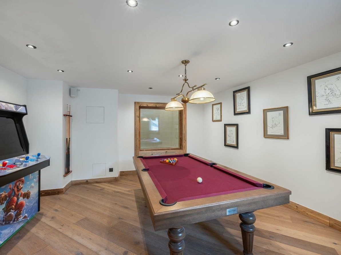 Шале Elegie — это не просто отправная точка для покорения склонов, это изумительное пространство для разнообразного досуга. Нижний этаж посвящен спа и развлечениям. Здесь вас ждет крытый плавательный бассейн, оснащенный искусственной волной, и сауна, призванная глубоко расслабить уставшие мышцы. Для любителей дружеских соревнований имеется игровой зал с бильярдным столом и классическим игровым автоматом, для развлечения гостей всех возрастов.